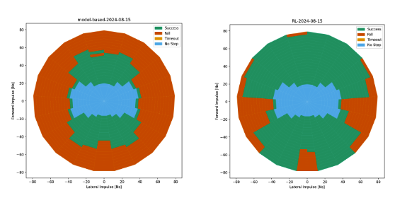 We’ve been able to demonstrate this in areas like step-recovery, where physics are particularly hard to model. In situations where Digit loses its footing, it’s often a result of an environment where we don’t have a good model of what’s going on – there might be something pushing on or caught on Digit, or its feet might be slipping on the ground in an unexpected way. Digit might not even be able to tell which issue it’s having. But we can train a controller to be robust to many of these disturbances with reinforcement-learning, training it on many possible ways that the robot might fall until it comes up with a controller that works well in many situations. In the following chart, you can see how big of a difference that training can make.